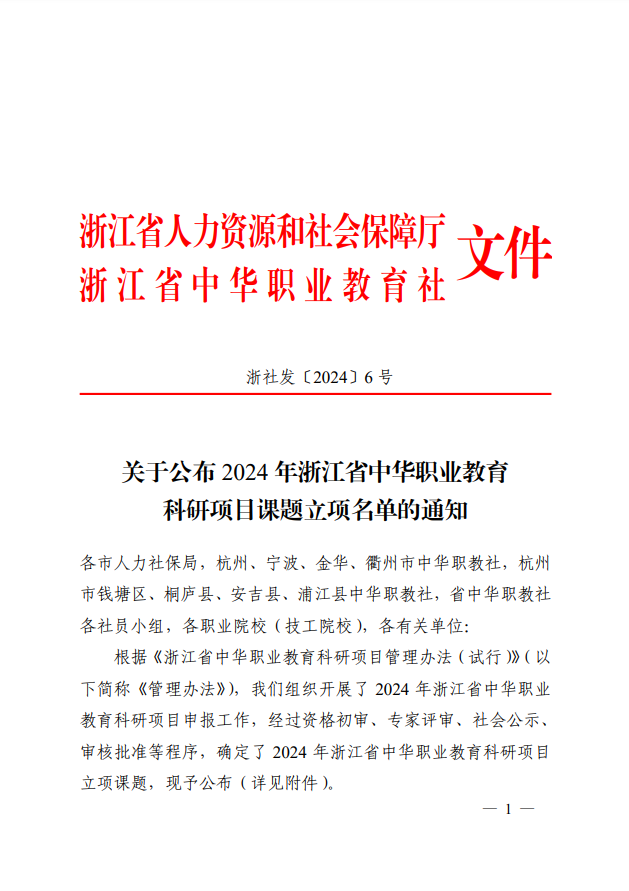 【立项通知】红足1世足球官网入口成功立项2024年浙江省中华职业教育科研项目课题1项