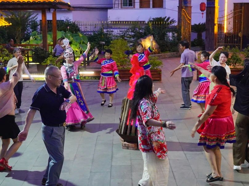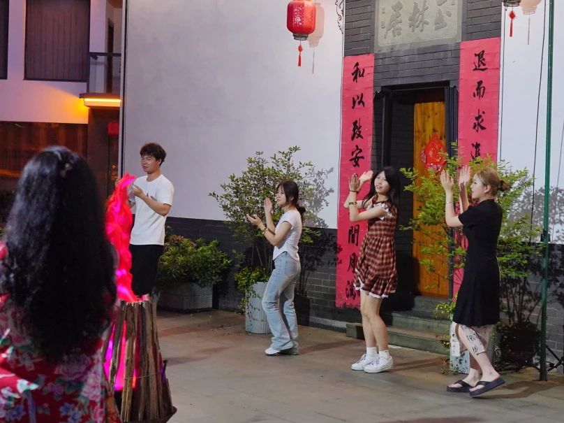 夜幕降临,蓝晓燕老师带着实践团成员们感受篝火晚会。畲族篝火晚会是一场充满民族文化魅力和热情好客氛围的盛会。在夜幕降临后举行,场地中央燃起熊熊的篝火,火光冲天,照亮了四周。我们围在篝火旁,形成了一个温馨而热烈的聚会氛围。畲族的歌舞表演是不可或缺的一部分,通过优美的歌声和欢快的舞蹈来表达对生活的热爱和对宾客的欢迎,舞蹈动作往往富有节奏感和韵律感。畲族篝火晚会是一场充满欢乐、温暖和文化底蕴的盛宴。它不仅是畲族人民欢庆节日、迎接宾客的重要方式,也是展现畲族文化魅力和民族特色的重要舞台。