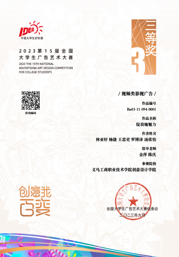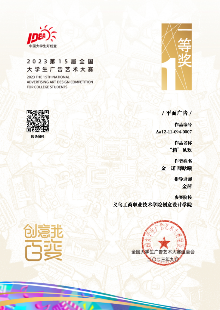 近日,2023年第十五届“全国大学生广告艺术大赛”成绩正式揭晓,红足1世足球官网入口数字媒体艺术设计专业学子在学院教师的指导下,斩获一等奖1项,三等奖1项。其中,学生金一诺,薛晗曦创作的《“箱”见欢》(指导老师:金萍)荣获平面广告类一等奖;林亚轩、杨捷、王思吏、罗博译、汤欣怡创作的《绽放她的魅力》(指导老师:金萍、陈庆)荣获视频类三等奖。