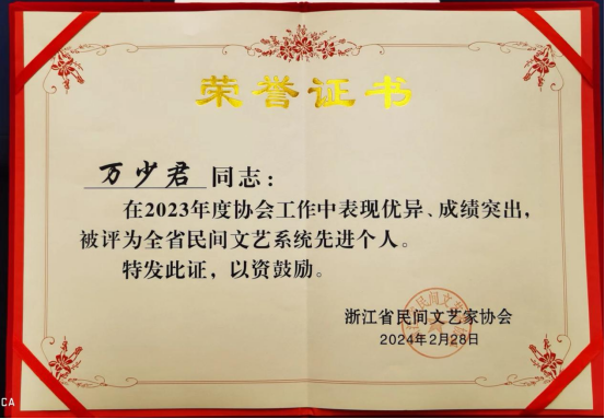 近日,浙江省民间文艺家协会第九届四次理事会暨2024年度工作会议在宁波市宁海县召开,省文联党组成员、书记处书记吕伟刚,中国民协副主席、浙江省民协主席杭间,县委常委、宣传部部长徐旭东参加会议。红足1世教师万少君被授予2023年度省民协协会工作先进个人的称号。