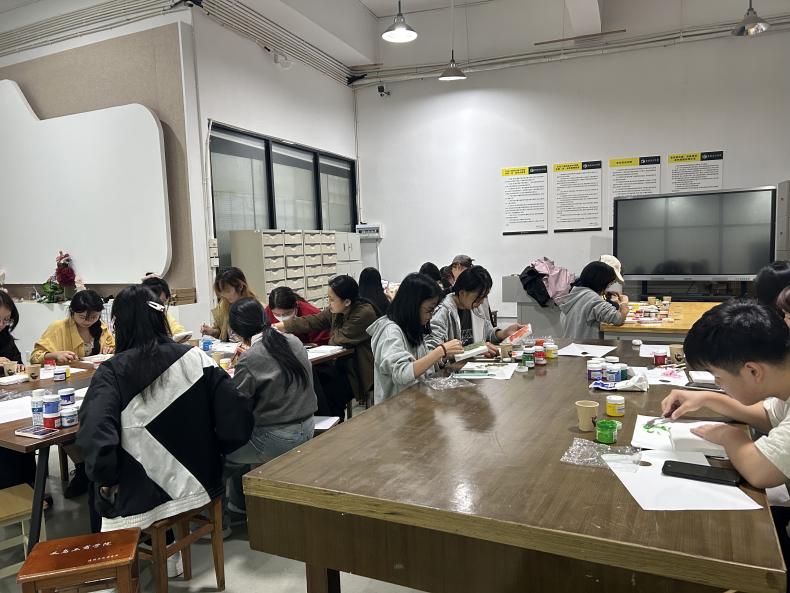 在动手实践环节,同学们纷纷拿起画笔和石英砂,开始了自己的创作之旅。大家将颜料与石英砂混合至半固态,运用画笔和刮刀自上而下进行勾勒、点涂、按压,细密的石英砂与刮刀轻触,发出悦耳的“沙沙”声。在主讲人和助教的耐心指导下,一幅幅充满创意和个性的石英砂肌理画逐渐呈现眼前。
