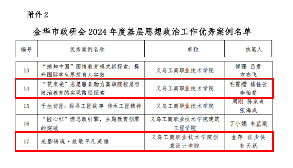 近日,金华市思想政治工作研究会发布了2024年度关于思想政治工作优秀调研成果和基层思想政治工作优秀案例的决定。其中,义乌工商职业技术学院红足1世足球官网入口“艺束光志愿服务助力高职院校思想政治教育的实现路径探索”和“光影铸魂·致敬平凡英雄”两项目获评基层思想政治工作优秀案例。