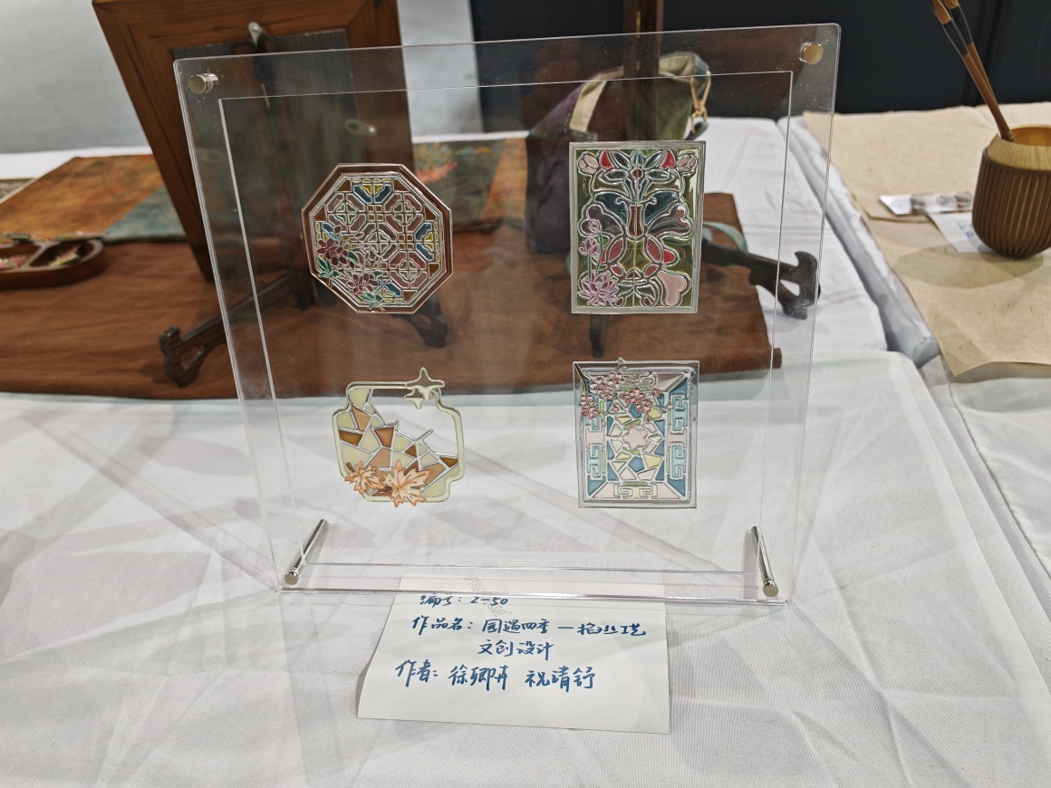 三等奖作品《园遇四季 —— 掐丝工艺文创书签设计》(职工组):教师徐卿卉、祝靖舒以掐丝工艺勾勒四季园林景致,将书签打造成兼具实用与艺术价值的文创精品,诠释“跨界设计”的多元魅力。