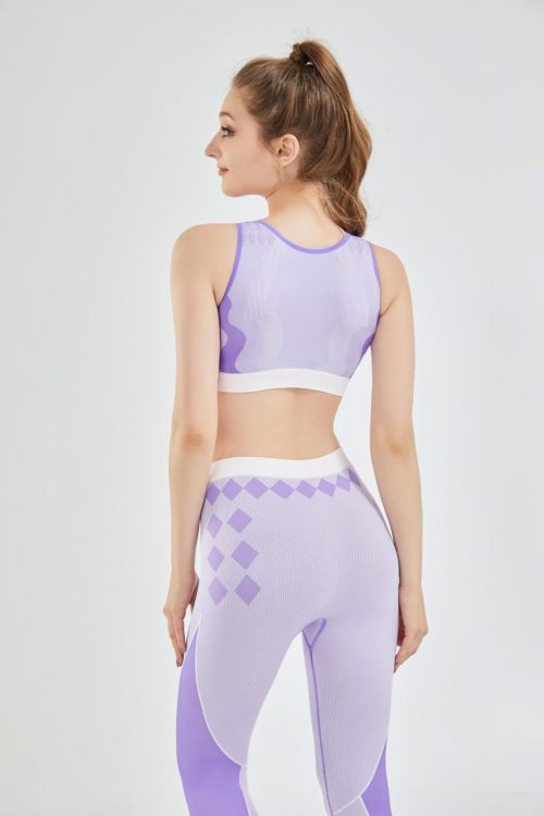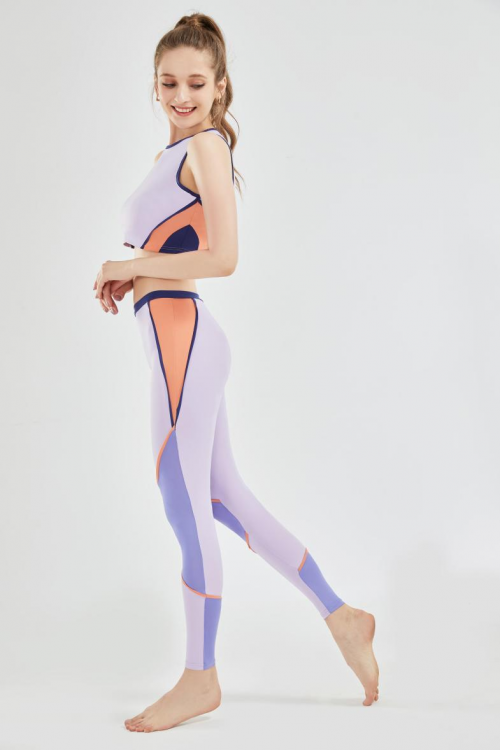 设计说明:这组瑜伽服采用简单式的背心设计,短上衣和长裤搭配,上衣下摆和长裤腰围为罗纹面料,且颜色一致。整体采用无缝针织,弹性良好适合运动穿着,此设计融合了几何元素,结构简易通过图案颜色来突出,不规则几何元素构成生活的方程式,不期然间的偶遇,长长短短。