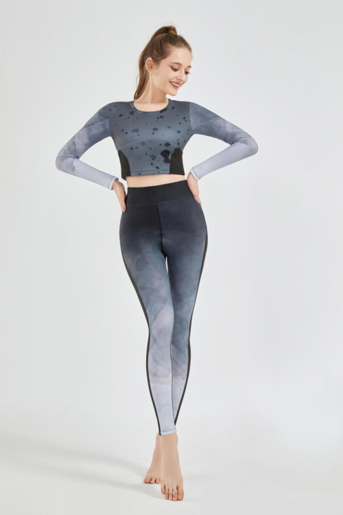 本系列灵感源于水墨画,上身采用大面积点墨设计,给人一种灵动活泼的感觉,还带有一种节奏感。下身则采用晕染水墨设计,给人一种柔和的感觉。整体则采用灰黑色调,使服装看起来更沉稳。款式上我选择了延展性较好的面料。上衣以短款为主 舒适时尚又有变化。领口采用了较大圆领,更好穿脱。下装收腰紧身提臀裤型,腿侧与腰侧选用透气面料,两侧黑色透气面料,在视觉上给人s型的感觉,更流畅更显瘦,在版型上也更有利于运动健身。