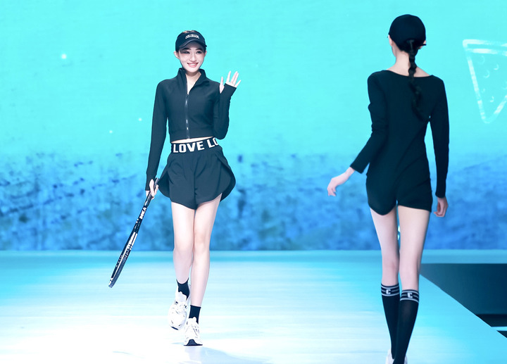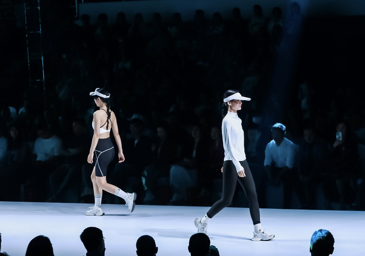 色彩鲜亮明快的糖果运动服、采用“黑科技”实用新型面料的专业瑜伽服、融合传统文化元素的新国潮产品、跨界互动的联名创意……在以“无界”为主题的秀场T台上,户外运动、多巴胺、功能性、奶茶联名等四个主题的百余套设计作品轮番登台,在专业模特的演绎下,闪亮呈现。