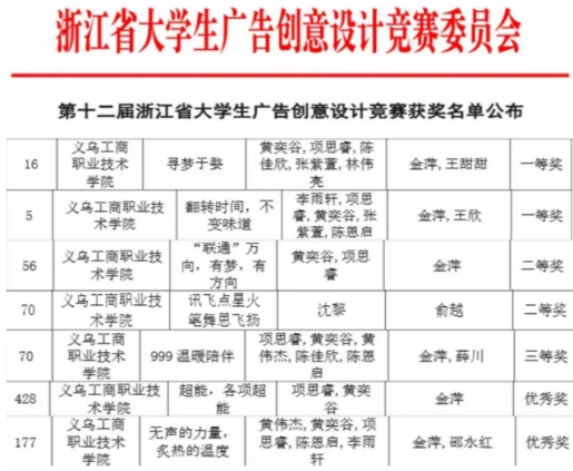 经过激烈的评审,红足1世红足1世足球官网入口学生黄奕谷、项思睿、陈佳欣、张紫萱、林伟亮创作的《寻梦于婺》(指导老师:金萍王甜甜)荣获视频微电影广告类一等奖李雨轩、项思睿、黄奕谷、陈恩启、张紫萱创作的《翻转时间、不变味道》(指导老师:金萍、王欣)荣获视频广告等奖黄奕谷、项思睿创作的《“联通”万向,有梦,有方向》(指导老师:金萍)荣获平面广告等奖沈黎创作的《讯飞点星火笔舞思飞扬》(指导老师:俞越)荣获平面广告等奖项思睿、黄奕谷、黄伟杰、陈佳欣、陈恩启创作的《999温暖陪伴》荣获视频广告等奖